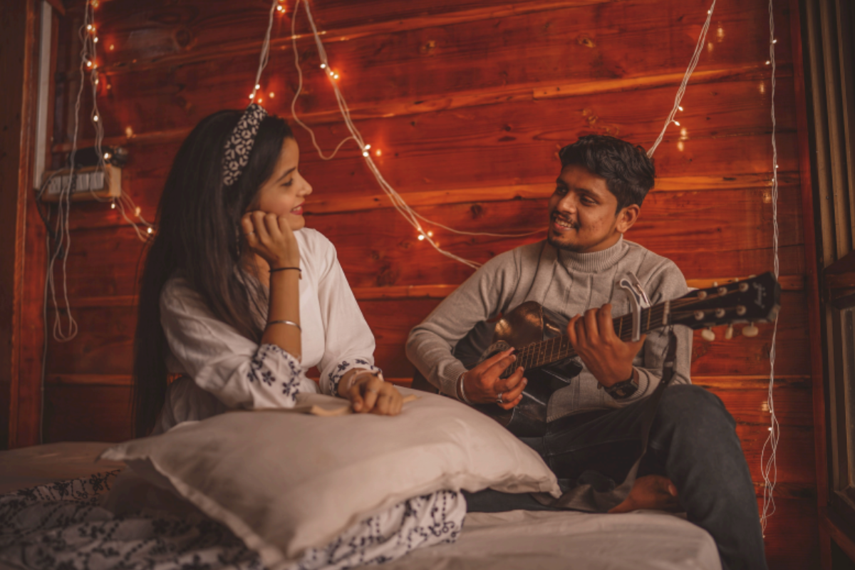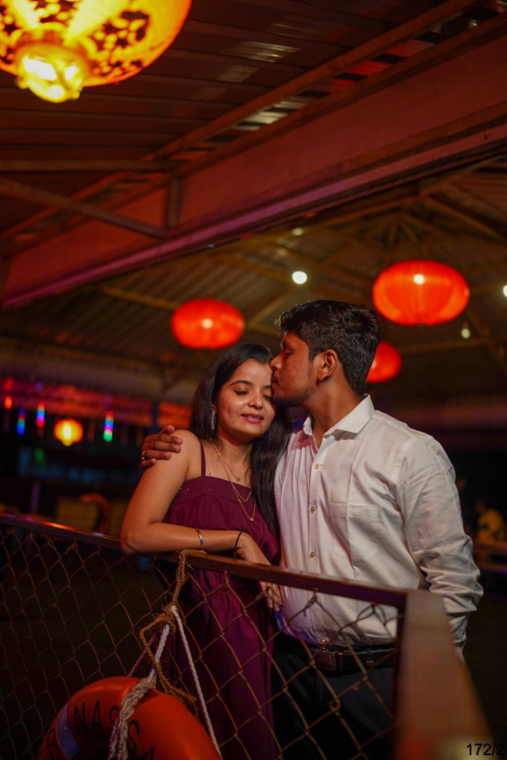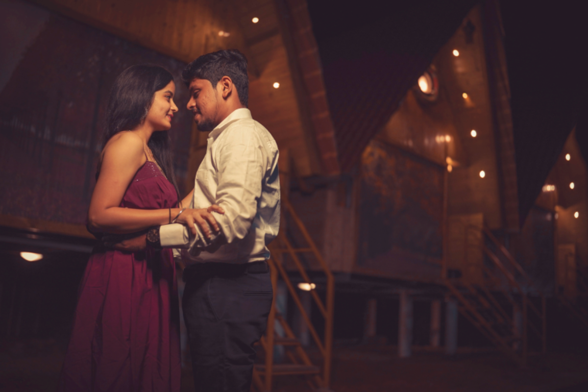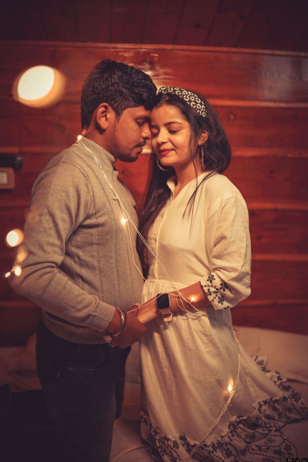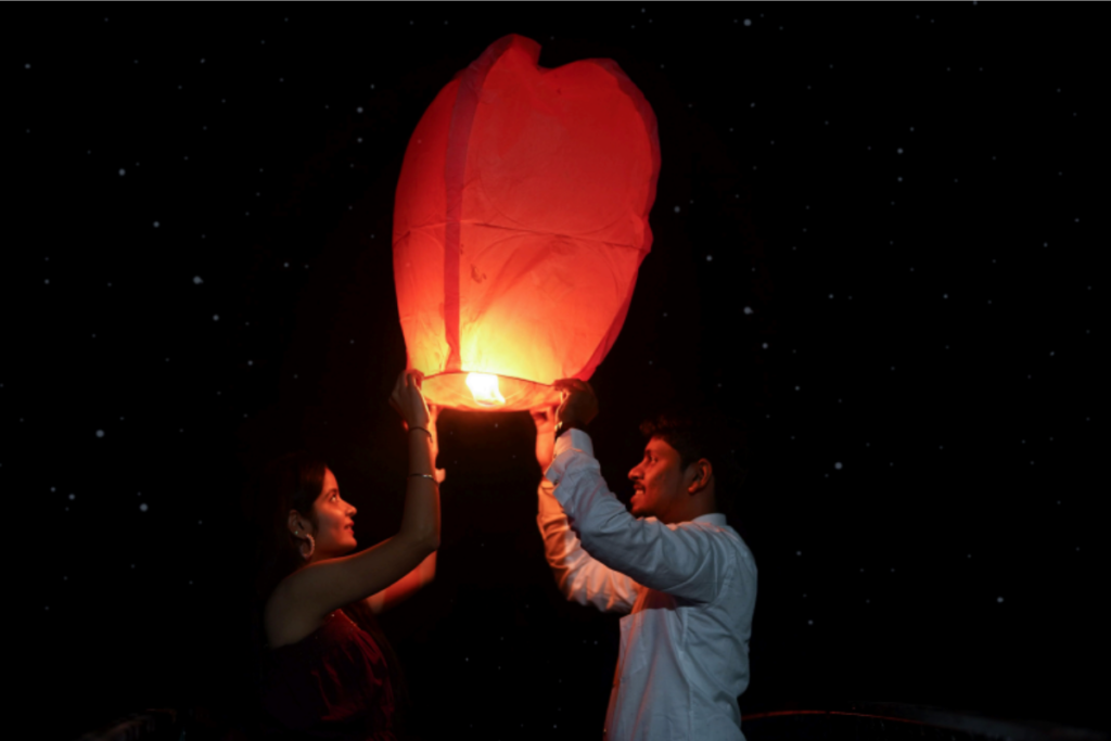 The shoot begins with Raj & Palak lighting a sky lantern together — symbolizing dreams, hopes, and the beginning of a shared future. The dark sky and glowing lantern created a dramatic cinematic frame, highlighting warmth in the middle of silence. The focus was on connection, eye contact, and shared intention.
